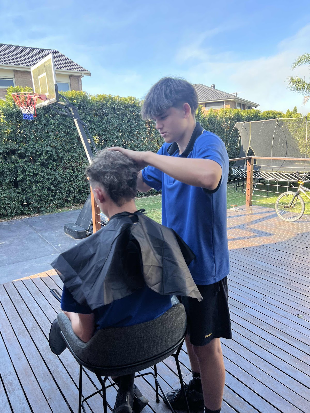 At least he is cutting hair on the deck now and not at school!